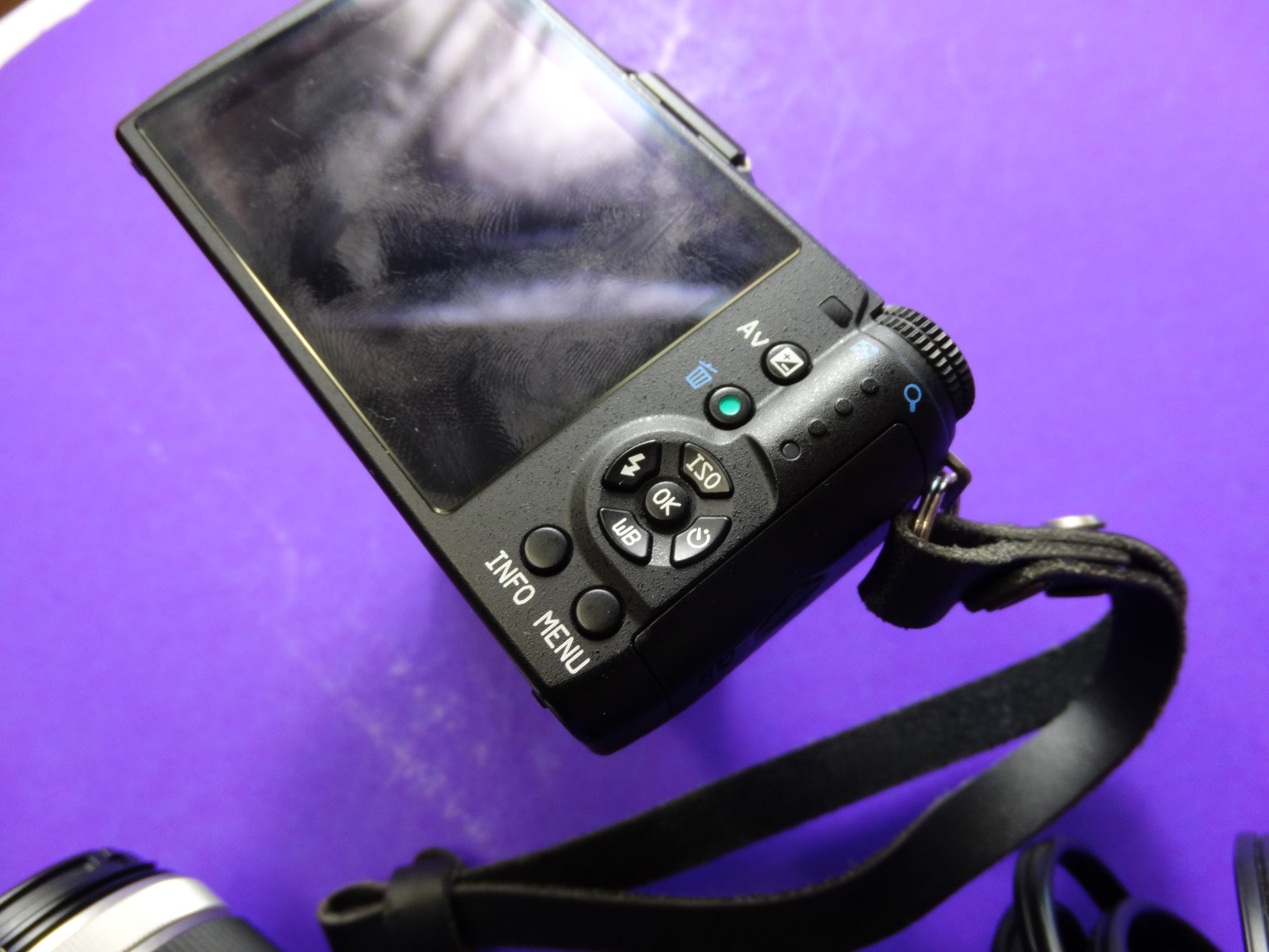 Accessories: Charger, power cable, and camera strap included
